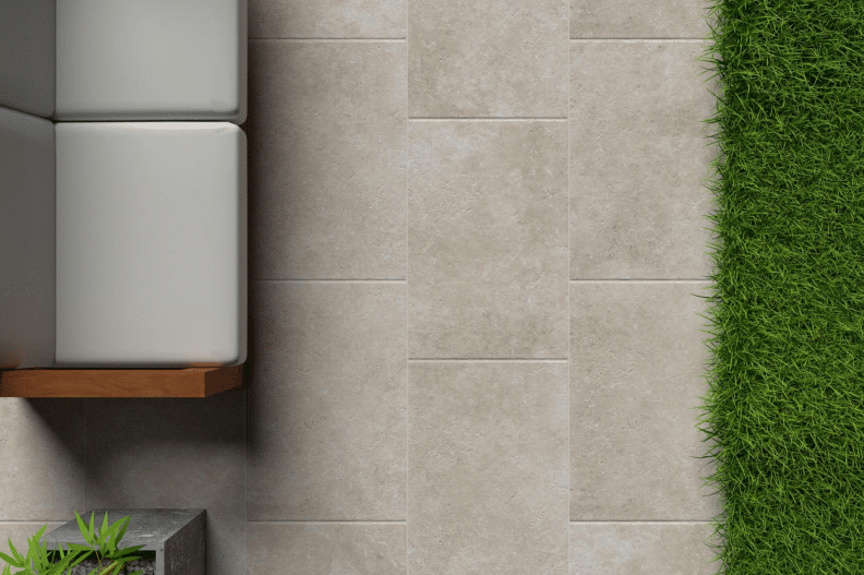 A travertine-look glazed porcelain tile. The P5 finish is suitable for use outdoors. Made in Italy.